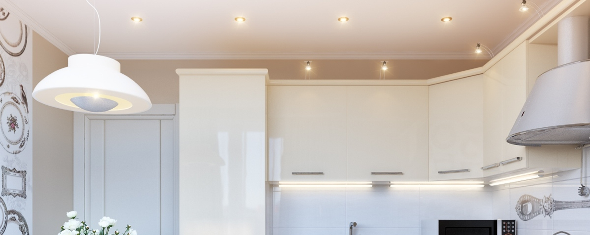 Натяжной потолок на кухне может играть как роль разделителя между зоной обеда и готовки, так и элементом дизайнерских предпочтений. Широкая цветовая палитра, дает хорошие возможности для выбора и сочетания, в случае если потолок многоуровневый.